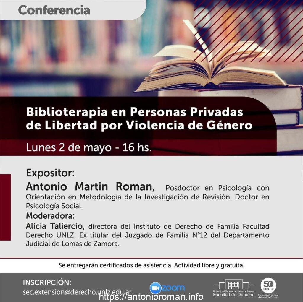 En esta oportunidad quería compartir con ustedes un video o conferencia virtual, en la que diserto sobre “Biblioterapia en personas privadas de la libertad por violencia de género” a partir de una invitación muy especial que me hiciera la Dra. Alicia Talierzo quien es directora del Instituto de Derecho de Familia Facultad de Derecho de Lomas de Zamora.