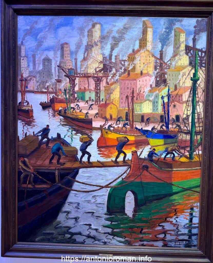 Benito Quinquela Martín. Elevadores a pleno sol, 1945 óleo sobre tela – 200 x 164 cm. Inventario 8823 depósito Comisión Argentina de Fomento Interamericano, 1945. Escuela de La Boca y Realismo social, 1920-1945. Museo Nacional de Bellas Artes.