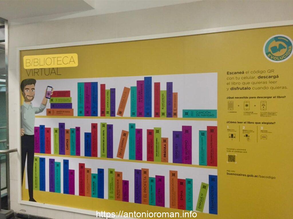 Biblioteca virtual del metro (subterráneo) de la Ciudad Autónma de Buenos Aires, se escanea un código QR para acceder al catálogo. BiblioMetro son pequeñas bibliotecas en las estaciones que ofrecen libros de autores panameños y extranjeros para fomentar la lectura.