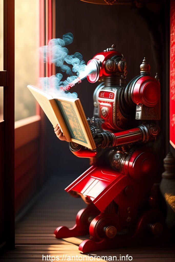 Un robot de máquina cyborg sabio rojo y blanco fumando una pipa de tabaco en una antigua casa china , tal vez leyendo un libro y usando anteojos , y tal vez sentado en una vieja silla giratoria.
