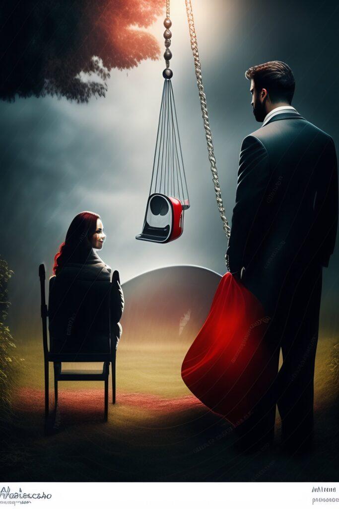 “Un hombre y una mujer enamorados de un control remoto rojo plateado sentados en un columpio miran una pantalla de terror en un lugar oscuro y sombrío con un fantasma de ai que tiene una sonrisa traviesa sentado en un columpio sentado en un columpio miraba una pantalla televisión de pantalla de terror. “
