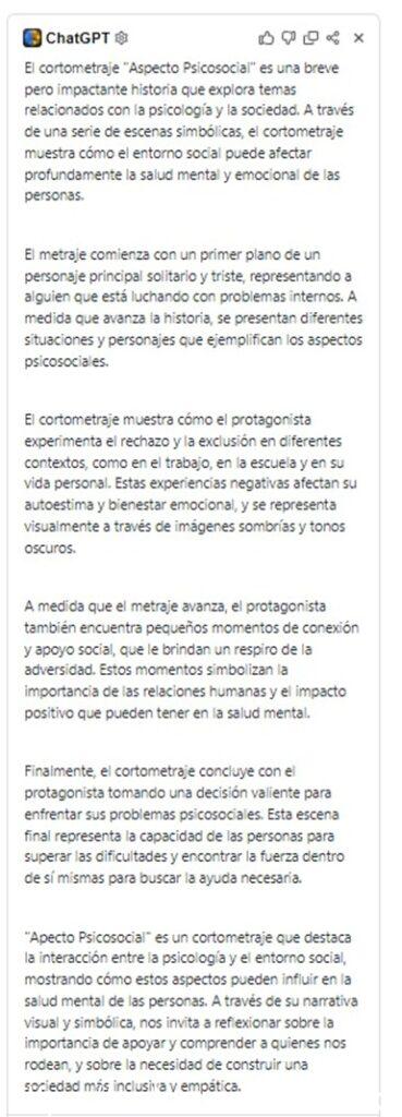 «Aspecto Psicosocial» es un cortometraje que destaca la interacción entre la psicología y el entorno social, mostrando cómo estos aspectos pueden influir en la salud mental de las personas. A través de su narrativa visual y simbólica, nos invita a reflexionar sobre la importancia de apoyar y comprender a quienes nos rodean, y sobre la necesidad de construir una sociedad más inclusiva y empática.