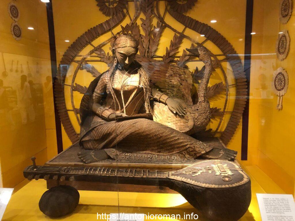 Escultura de Sarasvati en el National Museum, Nueva Delhi]: Sarasvati, diosa del saber, aparece tocando una veena, acompañada por un cisne. Representa la dimensión espiritual del conocimiento: música, gramática, memoria, recitación y discernimiento. Como deidad tutelar de los pandits, Sarasvati simboliza la integración armónica del saber.