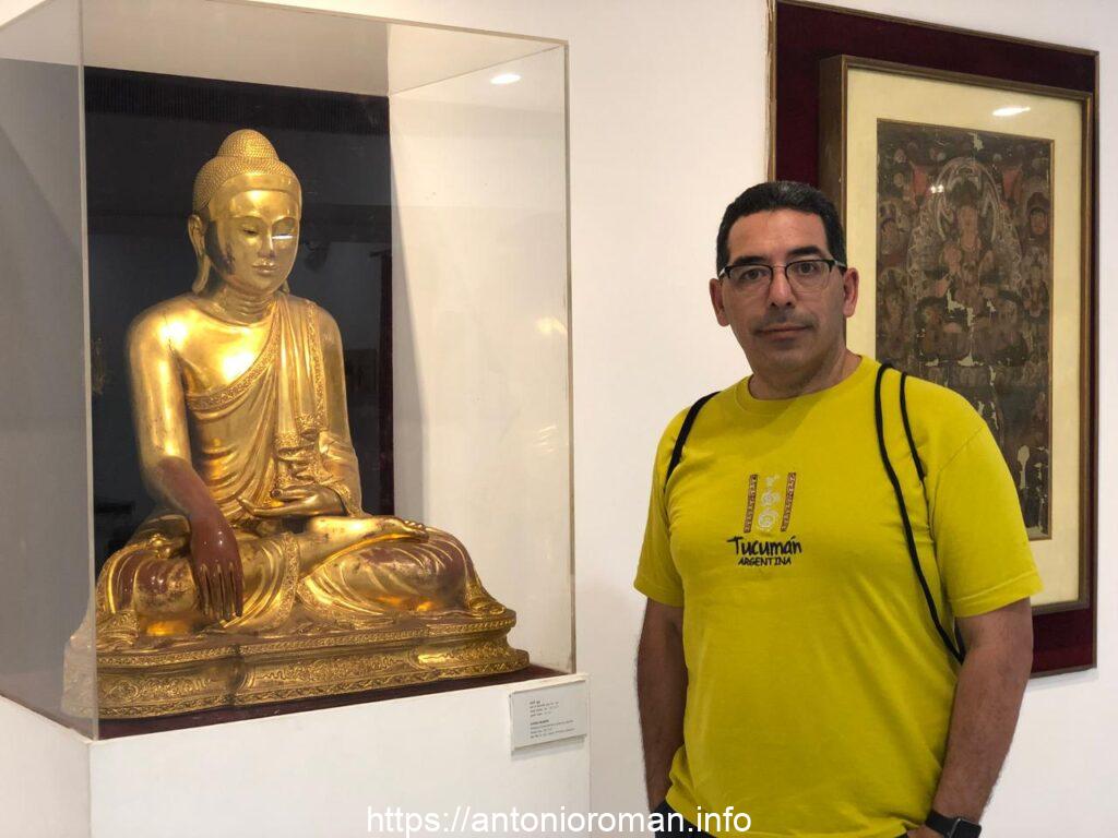 Durante mi visita al Museo Nacional de Nueva Delhi, tuve la oportunidad de contemplar una estatua dorada de Buda, obsequiada por el Primer Ministro de Birmania (Myanmar). Tallada en madera con pan de oro y conservada en la colección del Departamento de PCWA, esta figura aparece en postura de meditación con la mano derecha tocando la tierra (bhūmisparśa mudrā), símbolo del despertar espiritual. Esta experiencia fue profundamente significativa, ya que vinculé de inmediato la práctica meditativa y recitativa con los descubrimientos sobre neuroplasticidad y memoria oral.