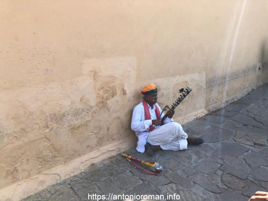 Músico tradicional en Rajasthan, calle de Devisinghpura]: Un intérprete popular ejecuta un instrumento folclórico (sarangi o ravanhatta). Aunque no es un pandit en el sentido clásico, representa la sabiduría oral comunitaria y la transmisión de la memoria colectiva mediante la música.