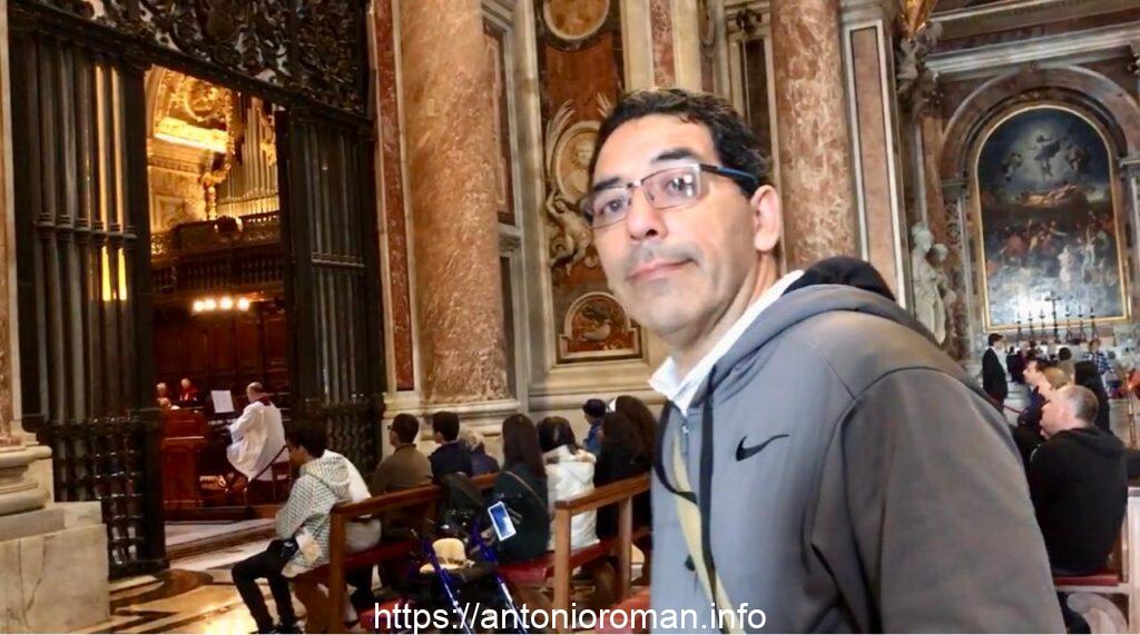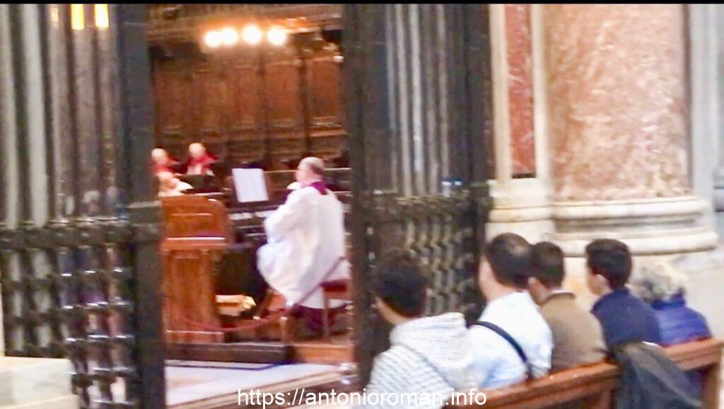 En la Basílica de San Pedro, un sacerdote con alba y estola púrpura toca el órgano en el coro, acompañado por clérigos que entonan canto litúrgico, mientras fieles escuchan atentos. Este canto sagrado —de tradición gregoriana y lugar privilegiado en la liturgia católica— no solo embellece la oración, sino que es oración en sí misma. Según el Catecismo, eleva el alma hacia lo divino, transformando el espacio en comunión espiritual a través de la belleza.