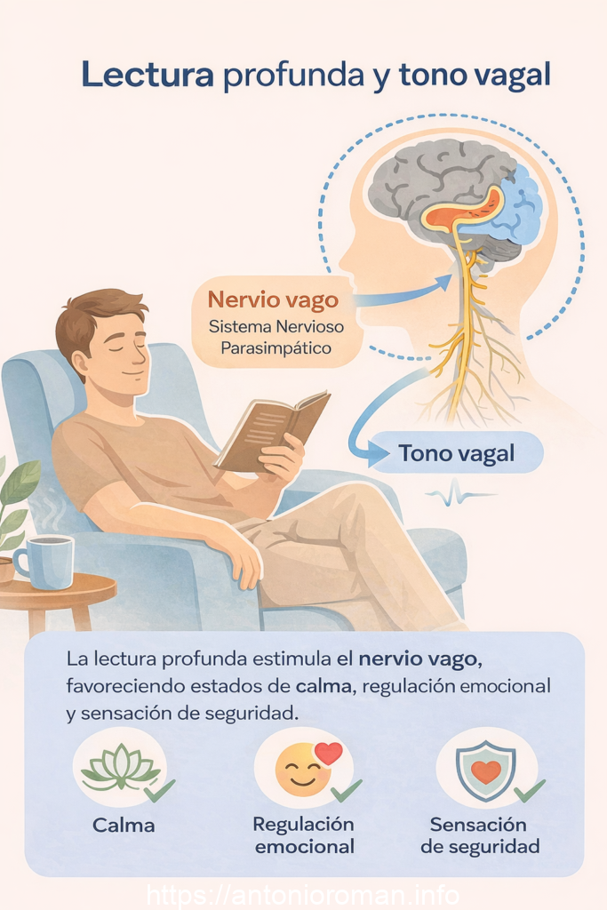 Un aspecto particularmente relevante es el tono vagal, vinculado al nervio vago y al sistema nervioso parasimpático. La lectura profunda puede favorecer estados de activación vagal asociados a calma, regulación emocional y sensación de seguridad. Esto conecta directamente con los fundamentos neurofisiológicos de la biblioterapia.