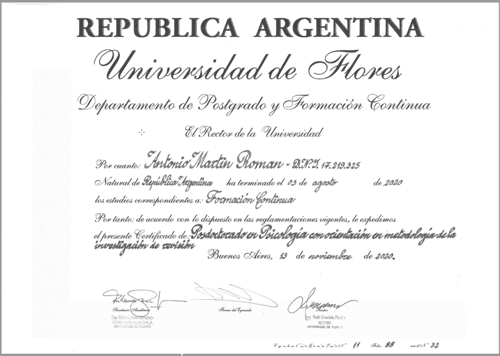 En primer lugar, comunicar mi formación completa, soy PosDoctor en Psicología con Orientación en Metodología de la Investigación de Revisión, Doctor en Psicología Social, Lic. en Bibliotecología y Documentación, y Especialista en Biblioterapia.